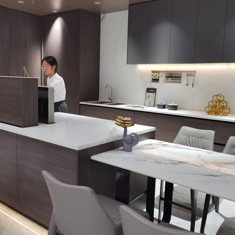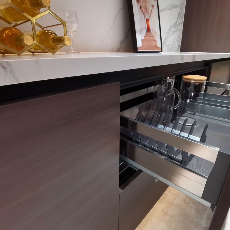 Qingdao Sinoya Co., Ltd. pozik eskaintzen dizu egur laminatuzko sukaldeko armairuak beirazko sukaldeko armairuekin bat datozenak. Pertsonalizatzeko, beheko armairuaren sakonera estandarra 500-600 mm-koa da, eta goiko armairu estandarrak 350-400 mm-koak.