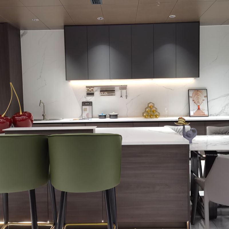 | Deskribapena | Egur laminatuzko sukaldeko armairuak beirazko sukaldeko armairuekin bat datoz |